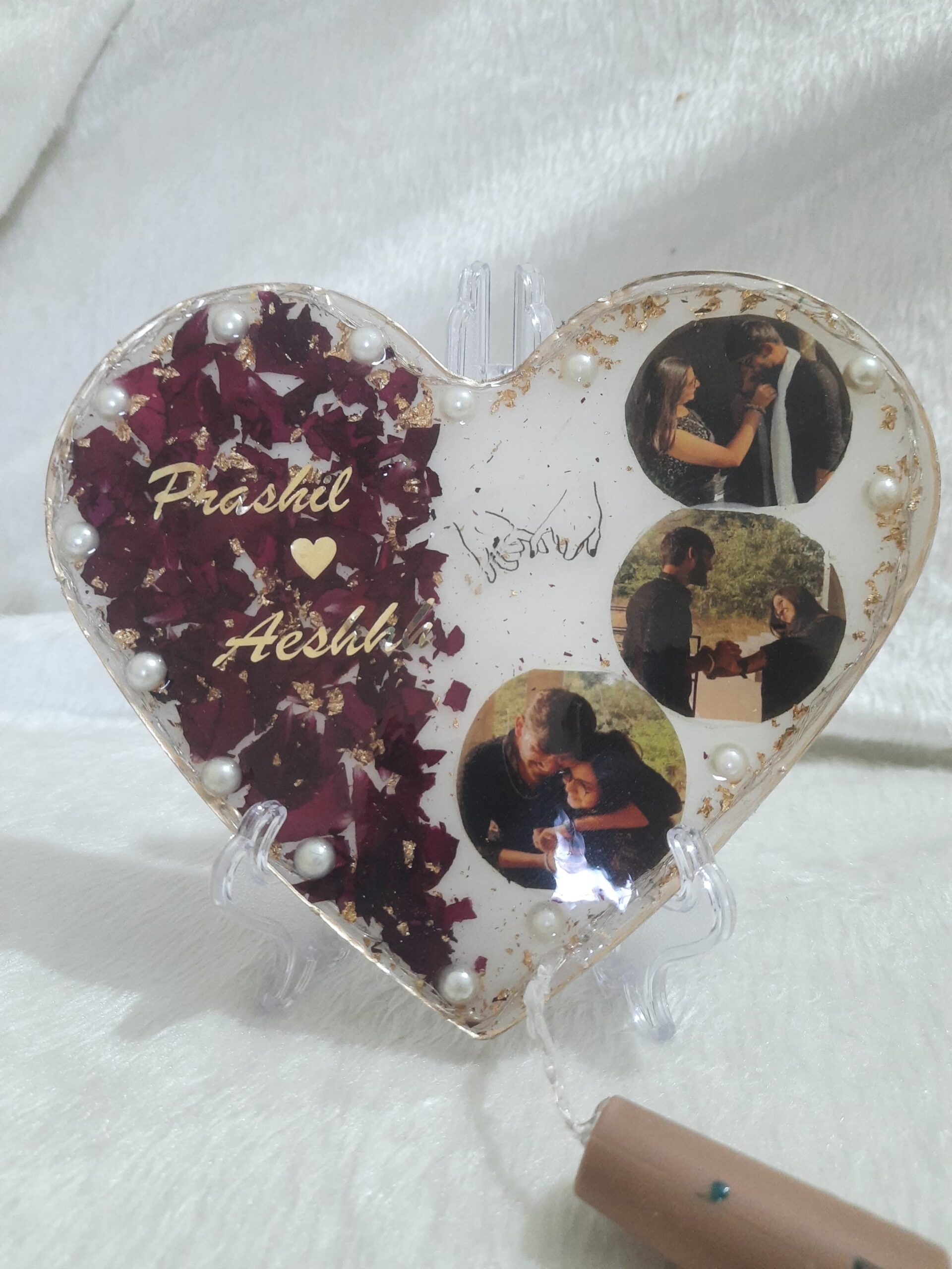 Customize this LED heart-shaped resin frame with names, photos, or decorative elements for a meaningful and glowing keepsake.